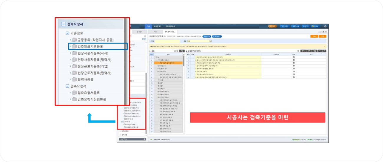 검측자료등록, 검측요청, 검측 등 일련의 검측 업무를 pc와 스마트폰을 활용하여 편리하고 신속하게 수행은 물론 자료를 db화 하여 표과적으로 보관, 조회, 출력할 수 있도록 지원합니다.